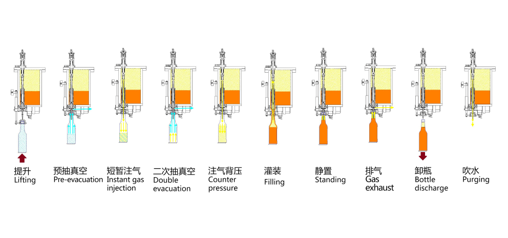 Equipped with high pressure jetting, bubble pressure sync control with filling speed. (Beer)